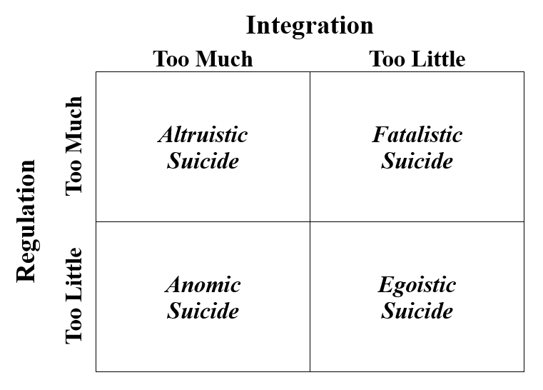 Durkheim identified four types of suicide, each corresponding to specific levels of social integration and regulation within society: altruistic suicide, egoistic suicide, anomic suicide, and fatalistic suicide.