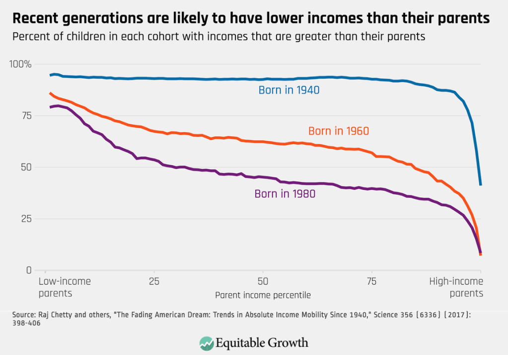 Additionally, race and gender compound the barriers to mobility. As we’ll see in future modules, structural racism and sexism affect access to education, housing, and employment, limiting opportunities for minority groups and women. Reeves argues that the intersection of race and class further disadvantages Black and Hispanic families, who face both economic and racial barriers to upward mobility. For instance, Black Americans born into poverty are much less likely to achieve upward mobility than their White counterparts (Source). Similarly, women, especially women of color, face additional challenges in securing leadership positions or high-paying jobs due to gender biases in hiring and promotion practices (Source).