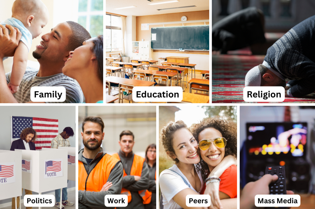 - Identify major agents of socialization—including family, education, religion, peers, media, political, and economic institutions—and evaluate their influence on individual identity and behavior.