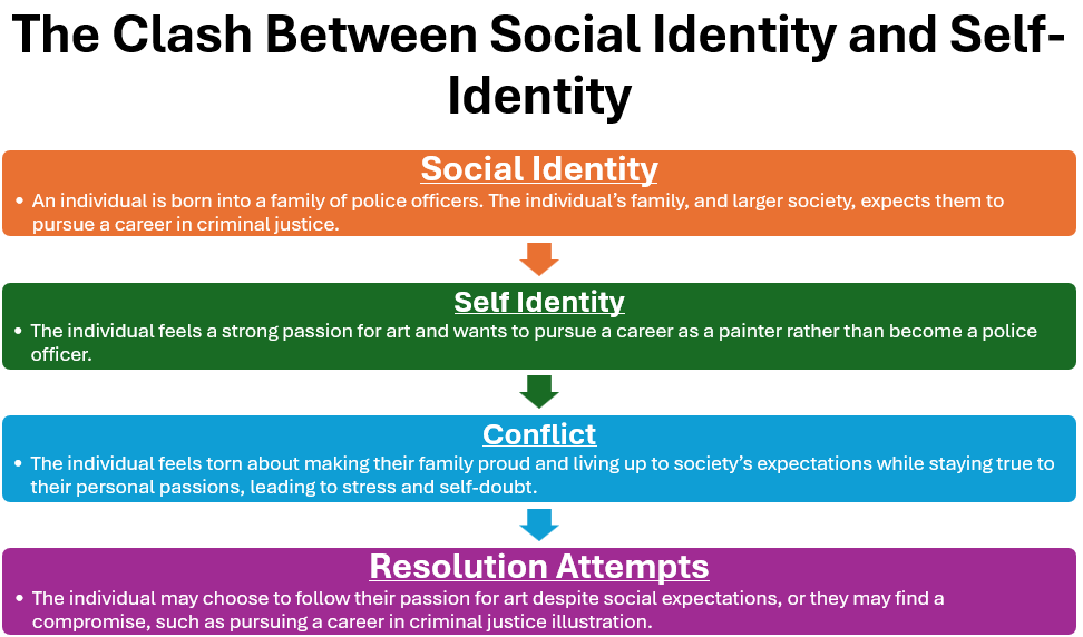 - Example: Someone may see themselves as an artist (self-identity) while society views them as a student (social identity).